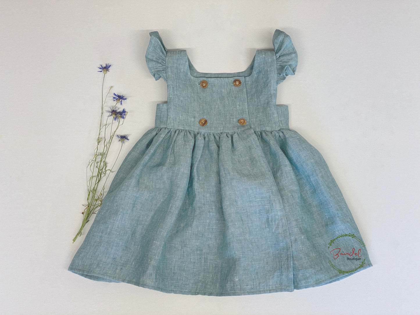 Soft linen dress in dusty mint with flutter sleeves, square neckline, and a charming ruffle hem. Wooden button details on the back add a playful touch. Perfect for special moments.