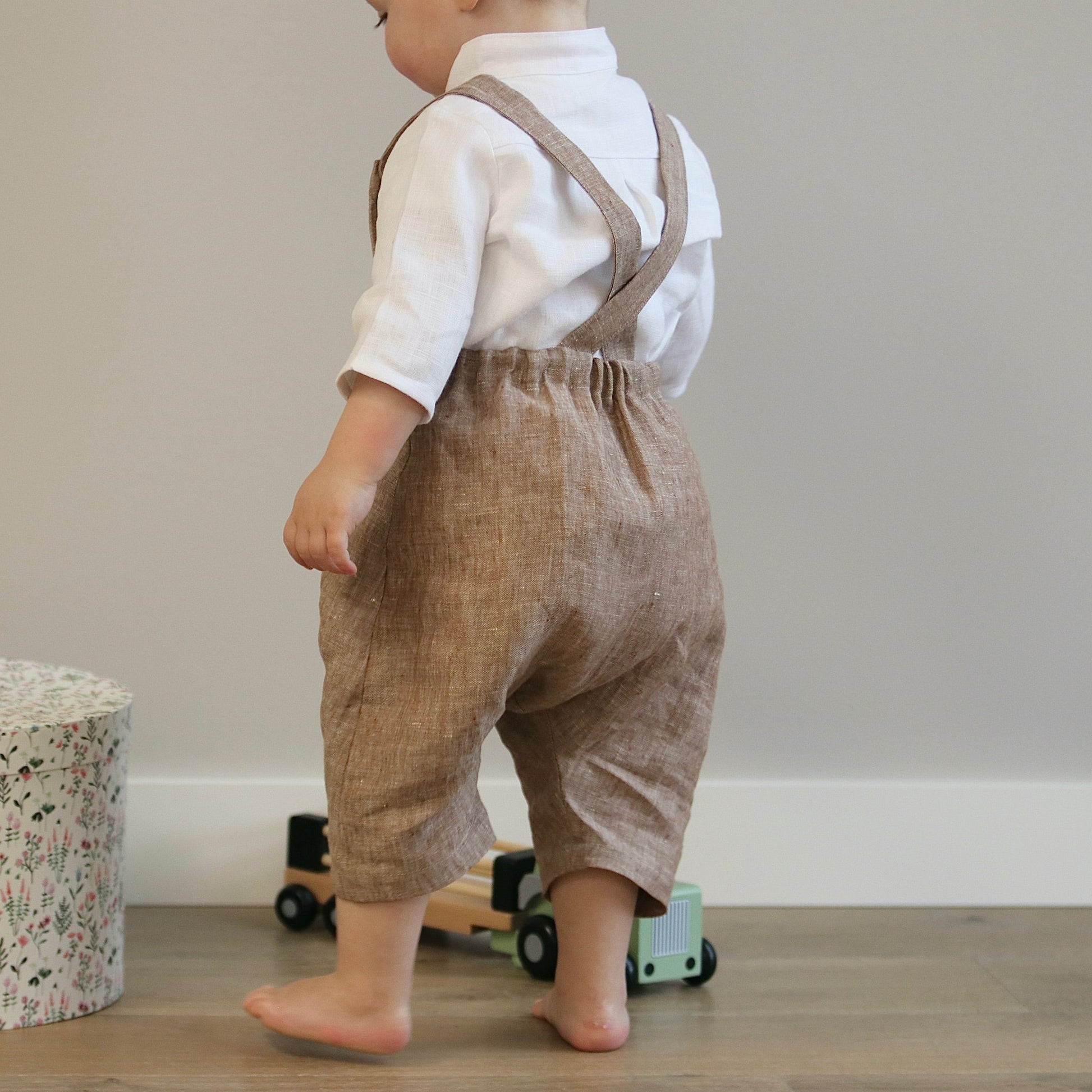 These elegant linen baby dungarees are the perfect blend of style and comfort. The 3/4 length shorts feature a classic curved front pocket and adjustable tie straps, along with an elastic back waistband for a custom fit. Whether for special occasions or everyday wear, these dungarees exude effortless sophistication.