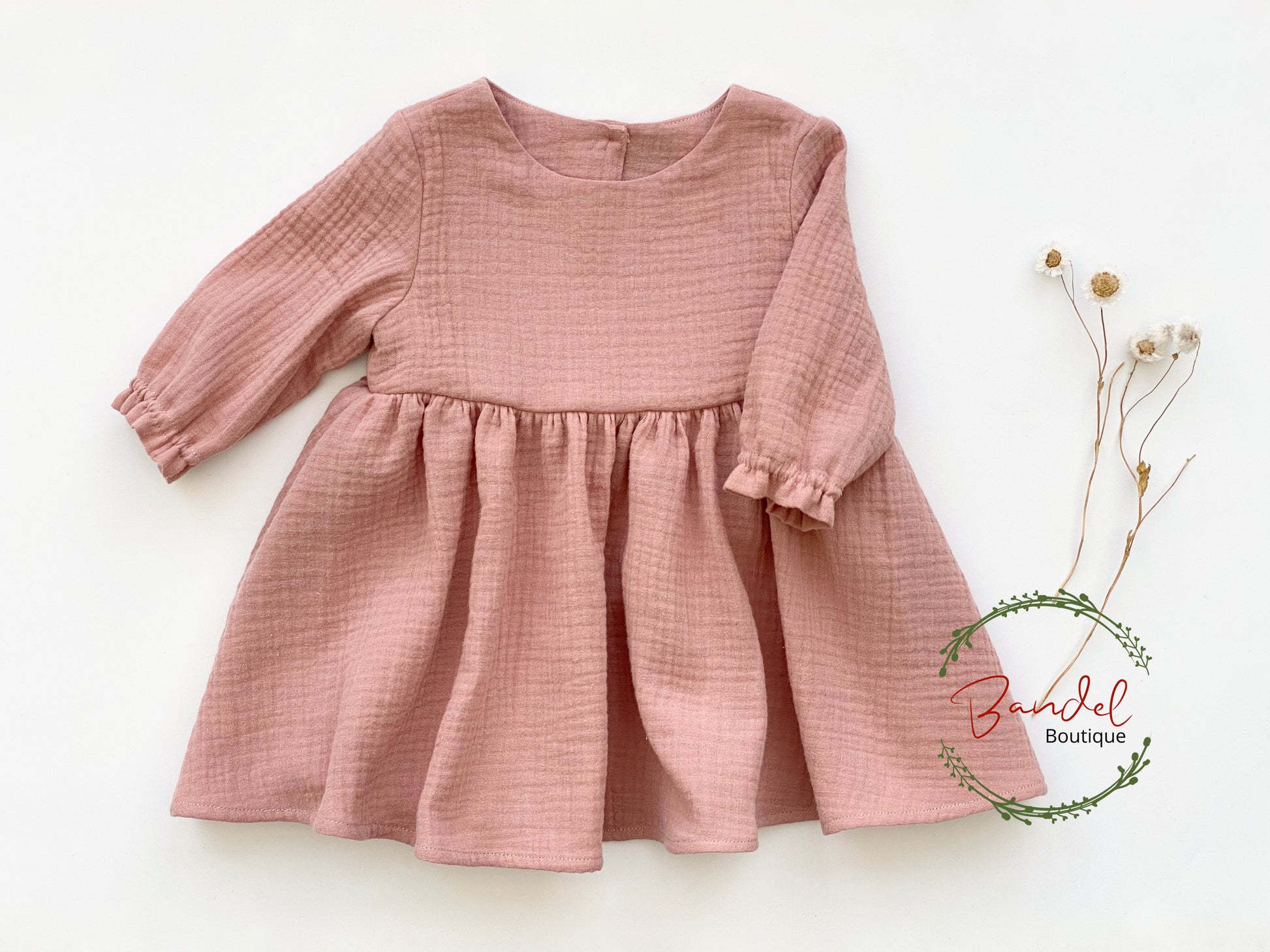 Soft organic muslin in a lovely dusty rose shade, this knee-length dress is perfect for active girls. Breathable and comfy for everyday wear, playtime, and special occasions alike!