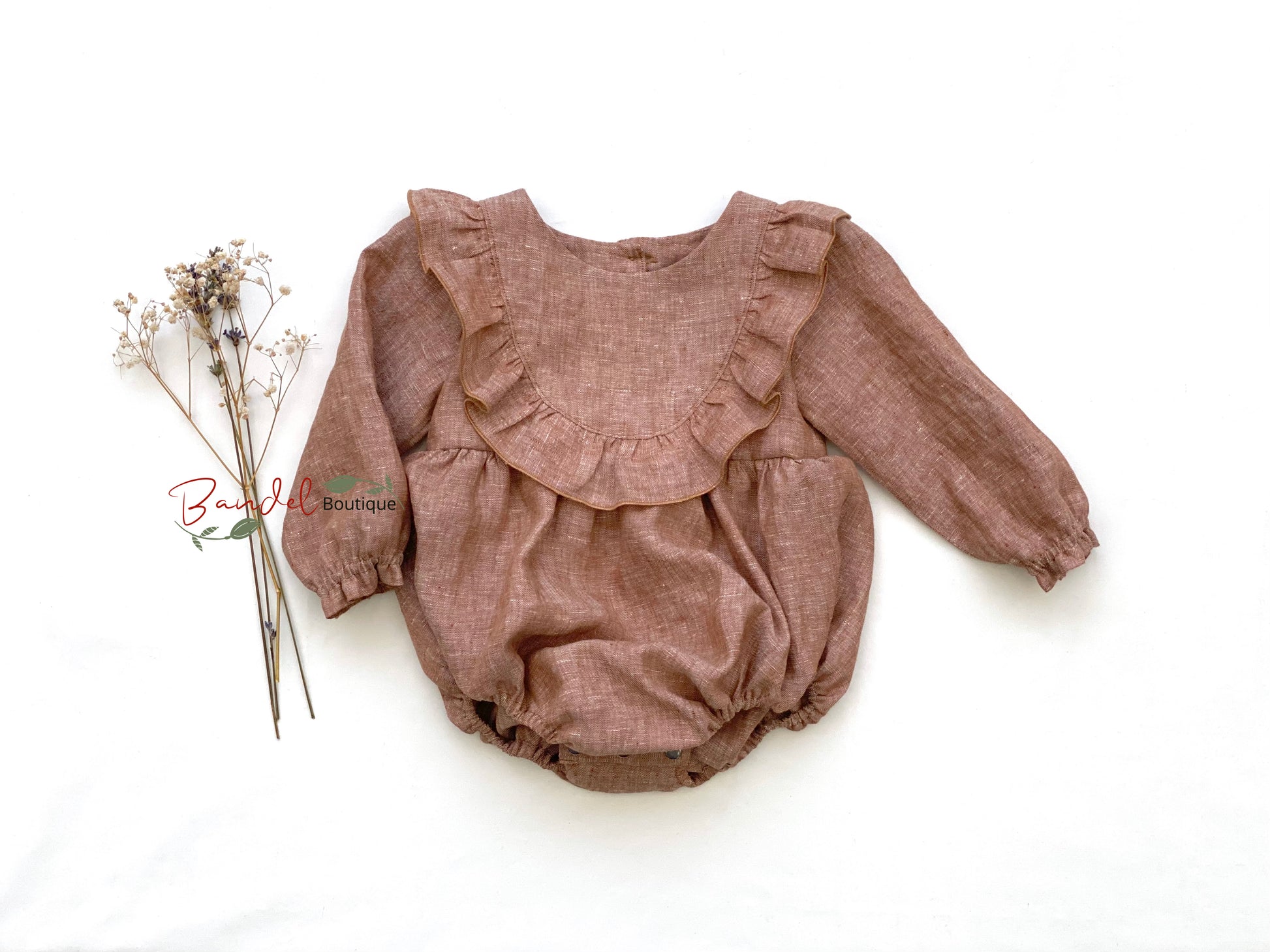 🌿 Features, Ruffled bodice, Wooden button back closure, Elastic at leg, Long-sleeves, Snaps at the crotch for easy diaper changes,